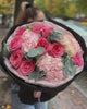Витончена композиція з півонієподібних троянд та пухких гортензій, з акцентами евкаліпта і делікатної зелені. Поєднання великих пелюсток і холоднуватої зелені створює легкий, повітряний об’єм і сучасний нюдовий настрій.