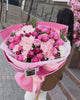 Яскрава композиція з хризантем та поєднання кущових і піоноподібних троянд у насичених рожевих відтінках. Обʼємна форма, щільна фактура пелюсток і виразна палітра створюють святковий настрій з першого погляду.
