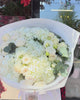 - Білі гортензії, білі кущові троянди, акцентна зелень за бажанням (евкаліпт); преміальне пакування і стрічка.