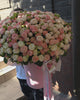 Вишукана композиція з кущових троянд у пудрових відтінках — від молочно-білих до кремово-рожевих і бежевих. М’яка палітра створює ефект легкої вуалі, що виглядає дорого, гармонійно й дуже ніжно. Такий формат — універсальний подарунок для ювілею, весілля, дня народження або як знак подяки.