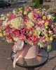 Витончена композиція у коробці-хетбоксі, де поєднані кущові й французькі троянди, фактурні гортензії, ніжні еустоми та акцентні хризантеми. Зволожена основа всередині зберігає свіжість і форму — букет виглядає святково без вази.