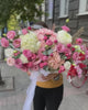 Вишукана квіткова коробка в сучасному стилі: ніжні кущові троянди, повітряна еустома, обʼємна гортензія та фактурна хризантема. Композиція зібрана на зволоженій основі, тому гарно тримає форму, не потребує вази та готова до дарування одразу після вручення.