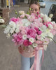 Ніжна композиція у коробці-хетбоксі, де аристократична французька троянда поєднується з текстурною кущовою трояндою, повітряною еустомою та рельєфною хризантемою. Зволожена основа зберігає свіжість без потреби у вазі — подарунок готовий одразу.