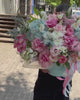 Вишукана композиція у коробці-хетбоксі, де об’ємна гортензія поєднується з тендітною еустомою, аристократичною французькою трояндою, текстурною хризантемою і розкішною півоноподібною трояндою. Зволожена основа зберігає свіжість, тож композиція виглядає святково відразу після вручення — без вази.