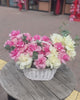 - Французькі троянди (мікс рожевих і білих відтінків), сезонна зелень, плетена корзинка