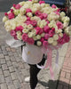 Вишукана композиція з кущових білих і рожевих троянд у великій капелюшній коробці. М’яка пудрова гама створює легкий перламутровий настрій — ідеально для освідчення, ювілею, весілля чи важливого життєвого моменту.